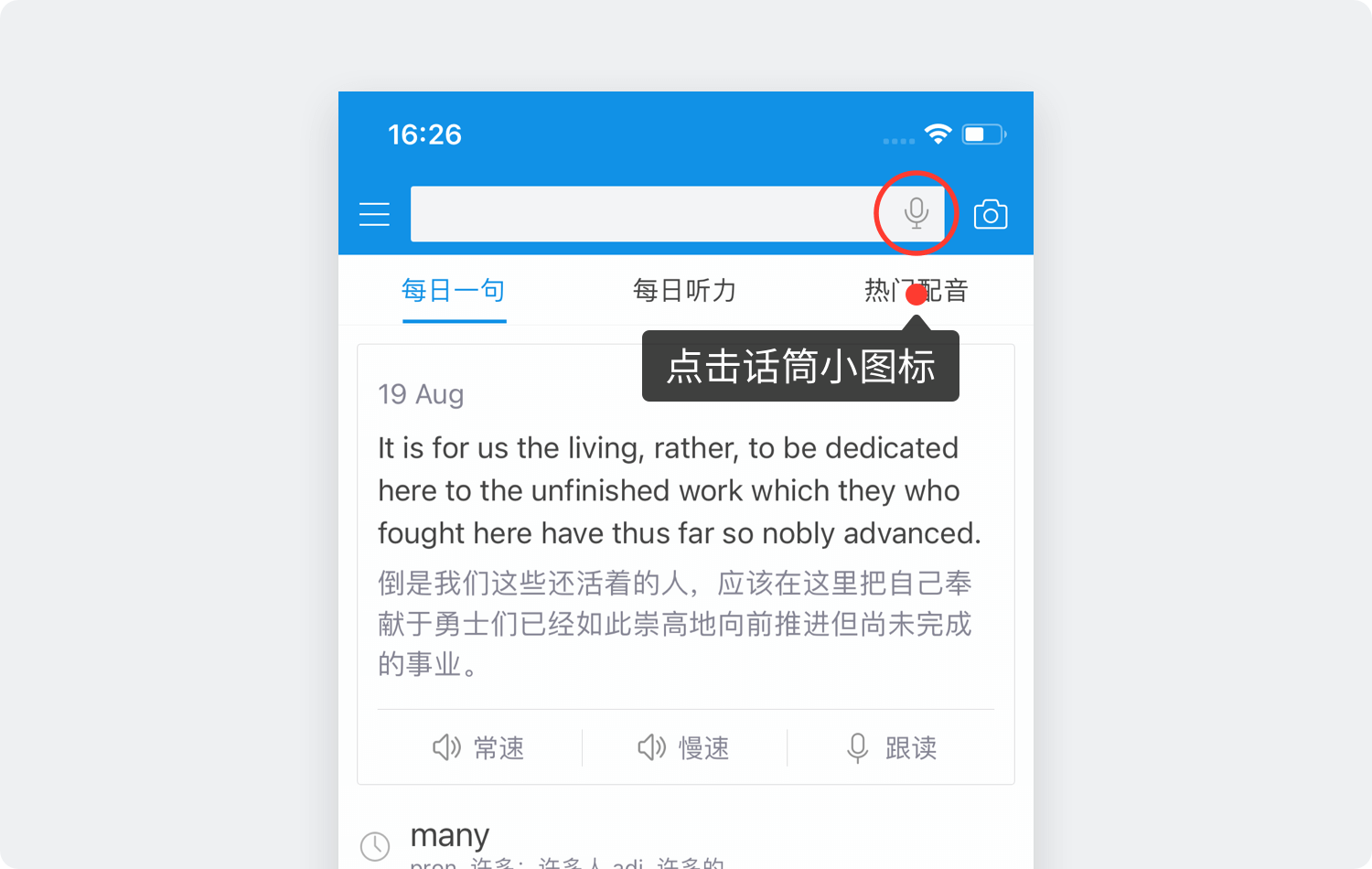 点击查词输入栏右边的相机图标即可。 有两种模式供您选择:您可以长按对焦取词,也可以使用拍照翻译。