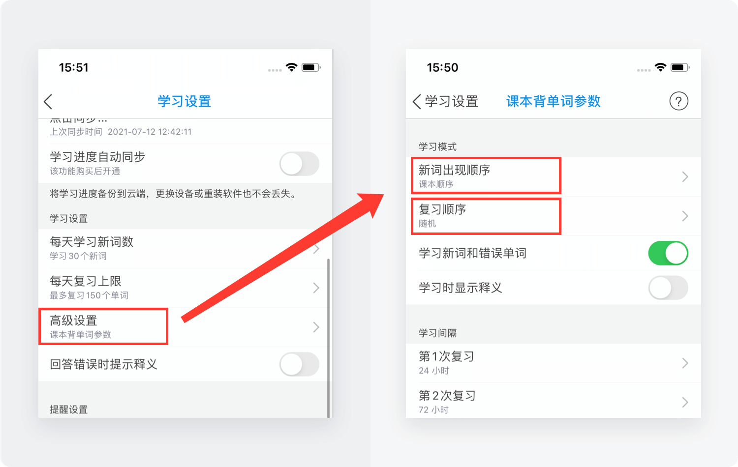 学习间隔:系统按照艾宾浩斯记忆曲线为您设置的单词复习间隔,您可以按需调整。